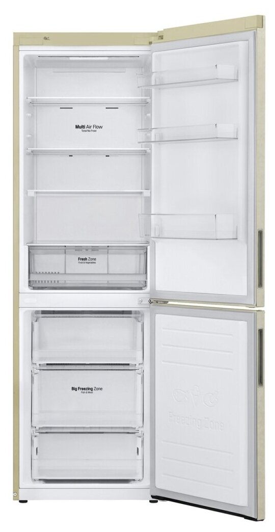 Стильный холодильник LG GA-B459CESL в бежевом цвете имеет объем 374 л. Это позволяет сохранить много продуктов охлажденными или замороженными. В морозильной камере три ящика с прозрачными стенками для быстрого поиска необходимого. В холодильном отсеке находятся четыре полки, изготовленные из закаленного стекла. Специальный контейнер обеспечивает удобное размещение фруктов или овощей.