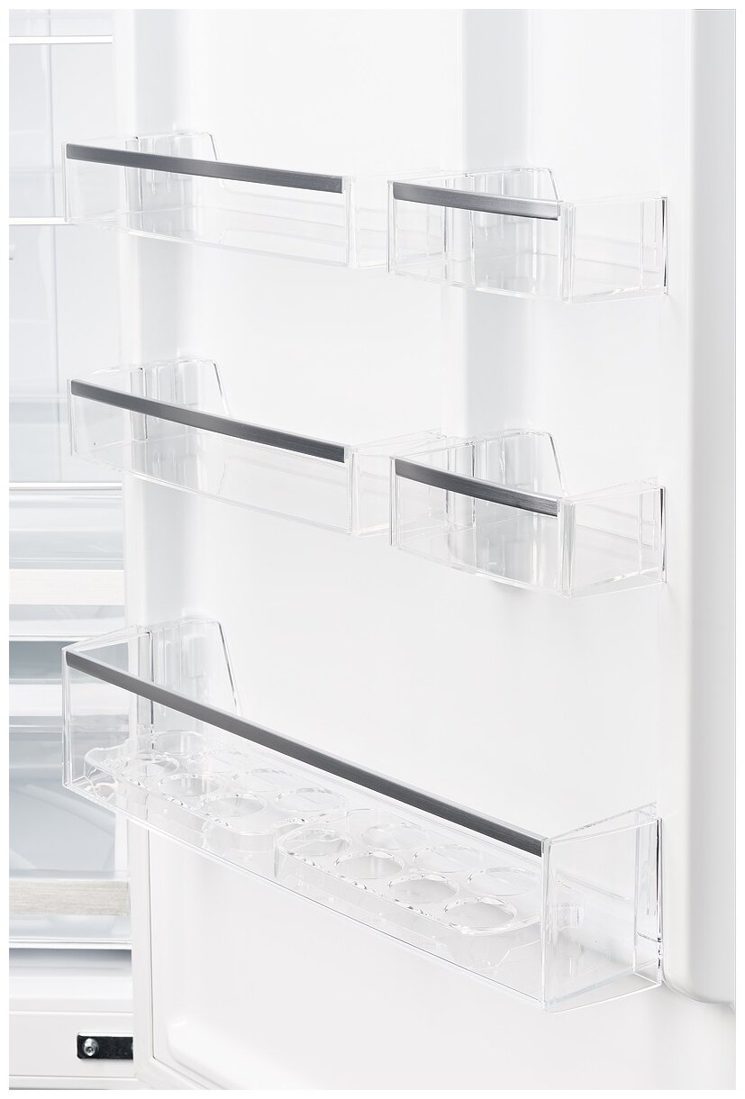 Дополнительная информацияколлекция Hi-Tech; светодиодное освещение камеры, держатель бутылок, навесные дверные полки: 4; отсек для овощей: 1; полка для яиц: 2шт; емкость для льда: 1шт.