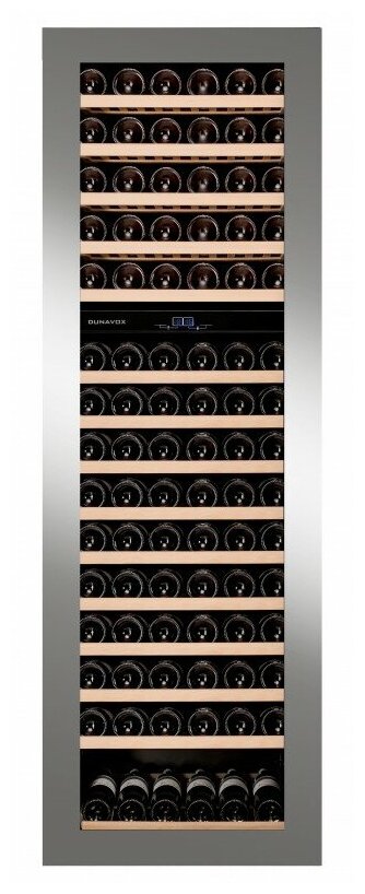 Dunavox DAB-114.288DSS.TO — встраиваемый винный шкаф, вмещающий 114 бутылок вина. Тонированный стеклопакет с защитой от УФ лучей обрамлен в стальную раму, открытие двери происходит одним нажатием на верхний левый угол с помощью системы Touch Open. Освещение голубого цвета позволяет легко ориентироваться внутри устройства.