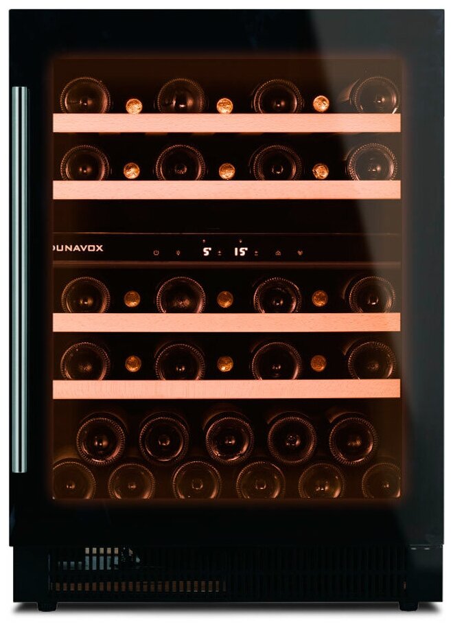 Винный холодильник Dunavox DAUF-39.121DB имеет две температурные зоны, в которых одновременно можно хранить разные сорта алкоголя и выставлять разные сочетания настроек. Он встраивается в нишу, что удобно, если у вас ограничен метраж помещения. Благодаря компактным размерам данная модель — отличный выбор для офиса, гостиничного номера. Количество бутылок, которое можно разместить с учетом полной комплектации и из расчета объема бутылки 0,75 л, — 39 шт.