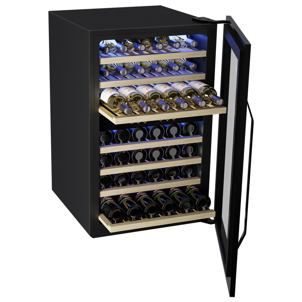 Винный холодильник Meyvel MV42-KBB2 имеет две температурные зоны, в которых одновременно можно хранить разные сорта алкоголя и выставлять разные сочетания настроек. Он встраивается в нишу, что удобно, если у вас ограничен метраж помещения. Благодаря компактным размерам данная модель — отличный выбор для офиса, гостиничного номера. Количество бутылок, которое можно разместить с учетом полной комплектации и из расчета объема бутылки 0,75 л, — 42 шт.