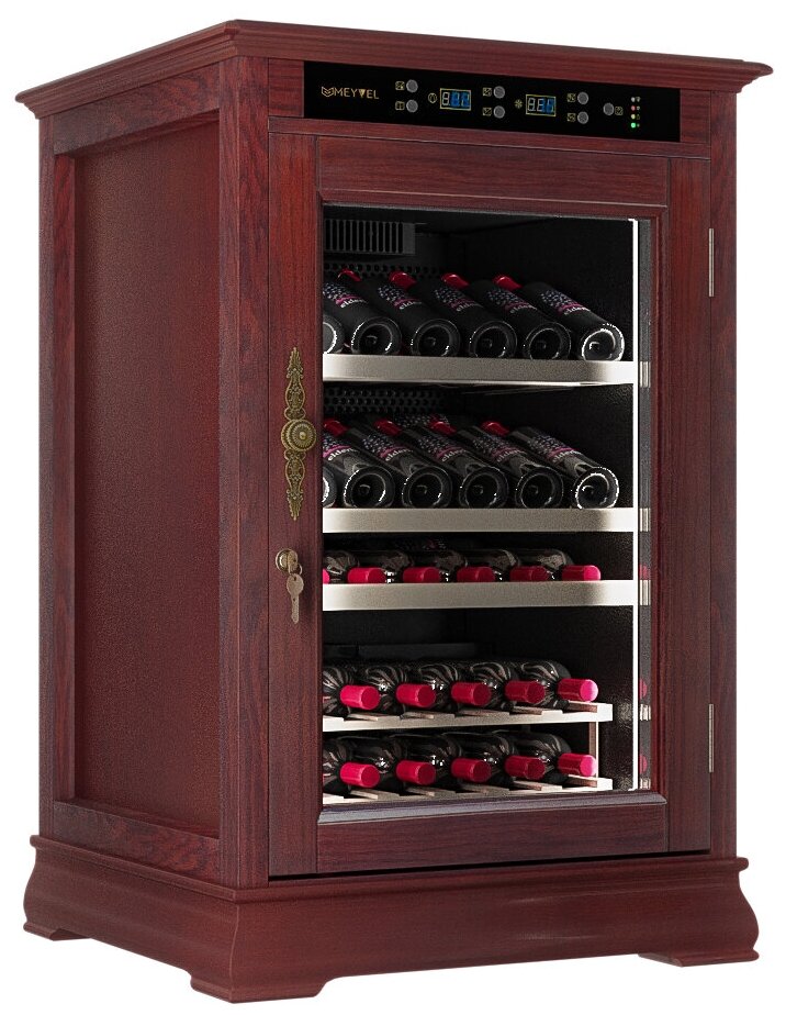 Стеклянная дверь — дополнительный изящный штрих к общему дизайну модели. Специальное покрытие защищает вино от влияния ультрафиолетовых лучей, которые проникают, если шкаф находится в солнечной комнате. Хранение становится еще безопаснее и герметичнее благодаря нескольким слоям стекол. Цвет корпуса — махагон.