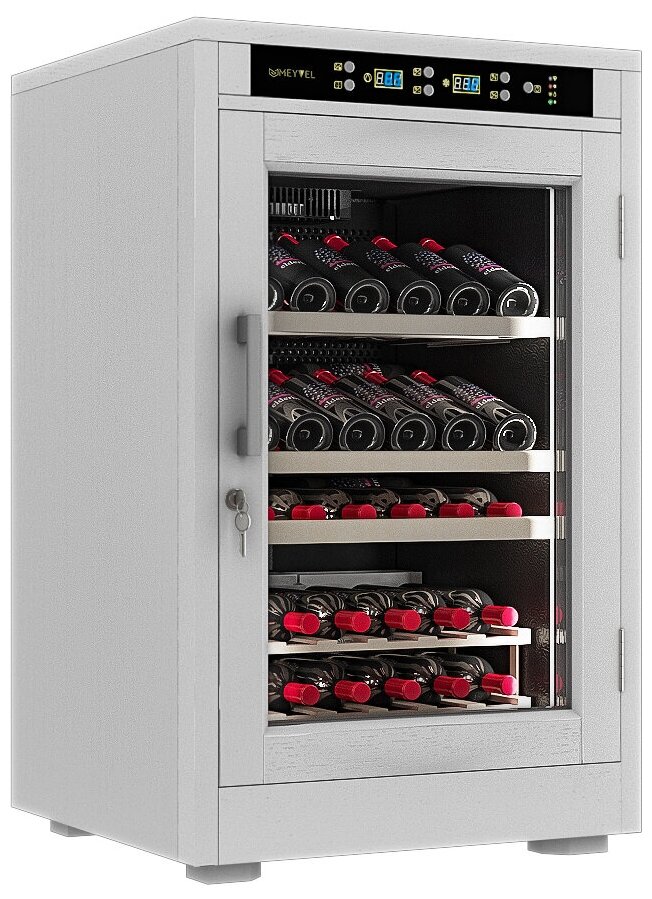 Винный холодильник Meyvel MV46-WW1-M имеет одну температурную зону, в которой можно разместить бутылки и единовременно выставить только одну комбинацию настроек. Он устанавливается отдельно, что удобно, если у вас есть специальное помещение — кладовая, погреб и т.д. Количество бутылок, которое можно разместить с учетом полной комплектации и из расчета объема бутылки 0,75 л, — 46 шт.