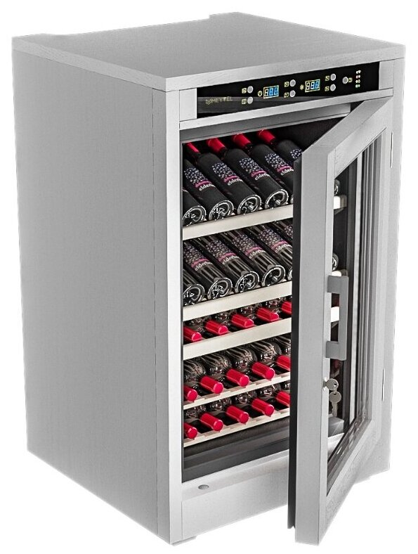 Стеклянная дверь — дополнительный изящный штрих к общему дизайну модели. Специальное покрытие защищает вино от влияния ультрафиолетовых лучей, которые проникают, если шкаф находится в солнечной комнате. Хранение становится еще безопаснее и герметичнее благодаря нескольким слоям стекол. Цвет корпуса — белый.