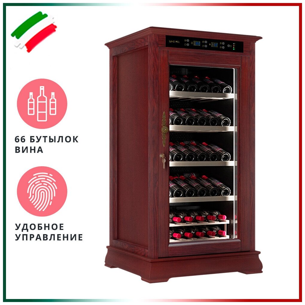 Стеклянная дверь — дополнительный изящный штрих к общему дизайну модели. Специальное покрытие защищает вино от влияния ультрафиолетовых лучей, которые проникают, если шкаф находится в солнечной комнате. Хранение становится еще безопаснее и герметичнее благодаря нескольким слоям стекол. Цвет корпуса — махагон.