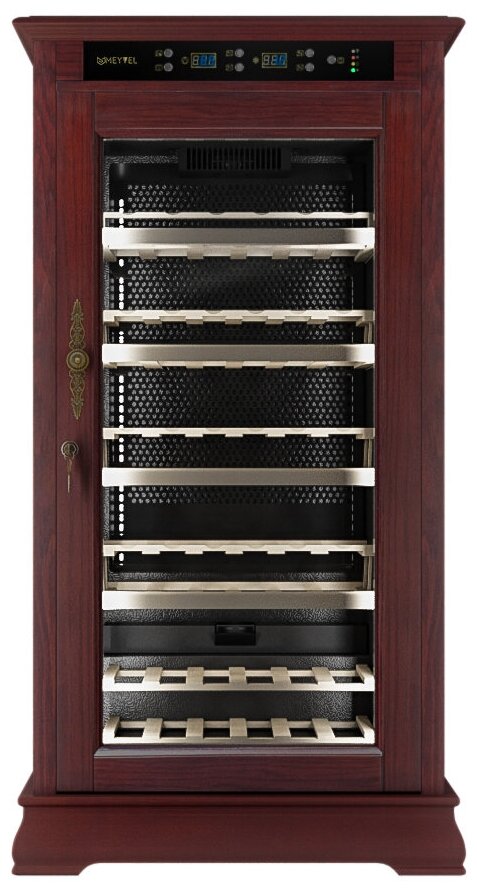 Винный холодильник Meyvel MV66-WM1-C имеет одну температурную зону, в которой можно разместить бутылки и единовременно выставить только одну комбинацию настроек. Он устанавливается отдельно, что удобно, если у вас есть специальное помещение — кладовая, погреб и т.д. Количество бутылок, которое можно разместить с учетом полной комплектации и из расчета объема бутылки 0,75 л, — 66 шт.