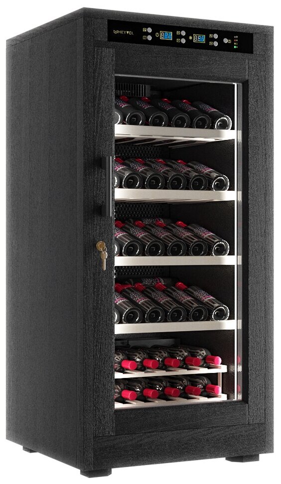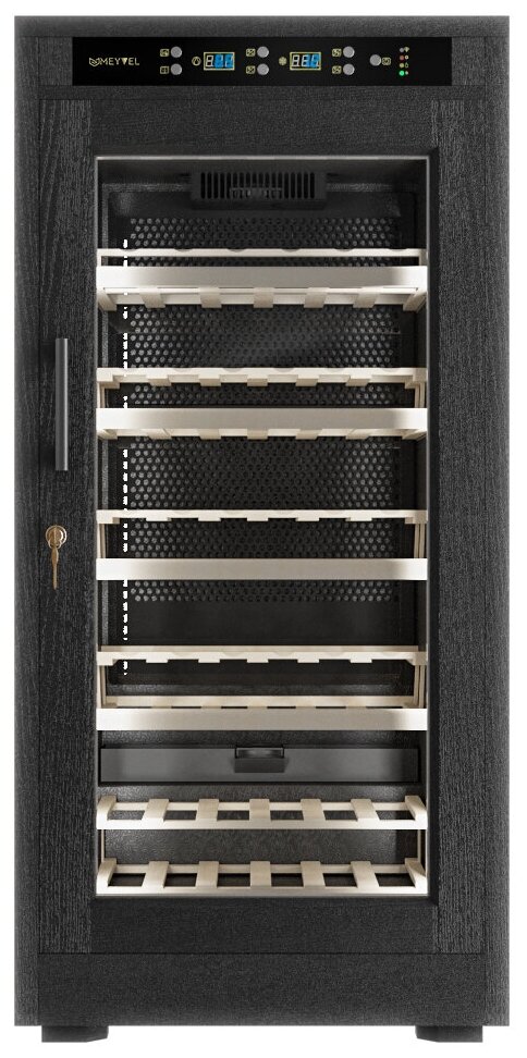 Винный холодильник Meyvel MV66-WB1-M имеет одну температурную зону, в которой можно разместить бутылки и единовременно выставить только одну комбинацию настроек. Он устанавливается отдельно, что удобно, если у вас есть специальное помещение — кладовая, погреб и т.д. Количество бутылок, которое можно разместить с учетом полной комплектации и из расчета объема бутылки 0,75 л, — 66 шт.