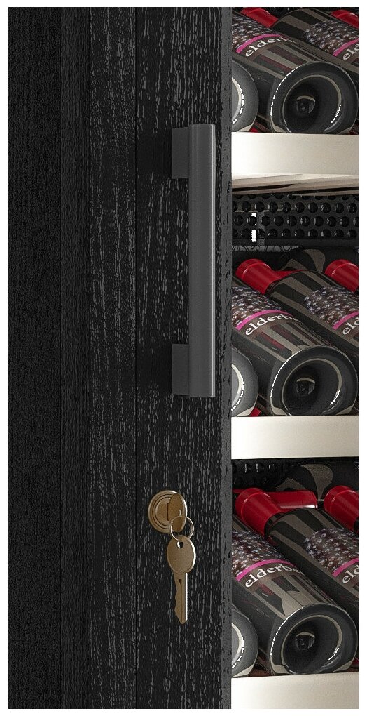 Стеклянная дверь — дополнительный изящный штрих к общему дизайну модели. Специальное покрытие защищает вино от влияния ультрафиолетовых лучей, которые проникают, если шкаф находится в солнечной комнате. Хранение становится еще безопаснее и герметичнее благодаря нескольким слоям стекол. Цвет корпуса — черный.