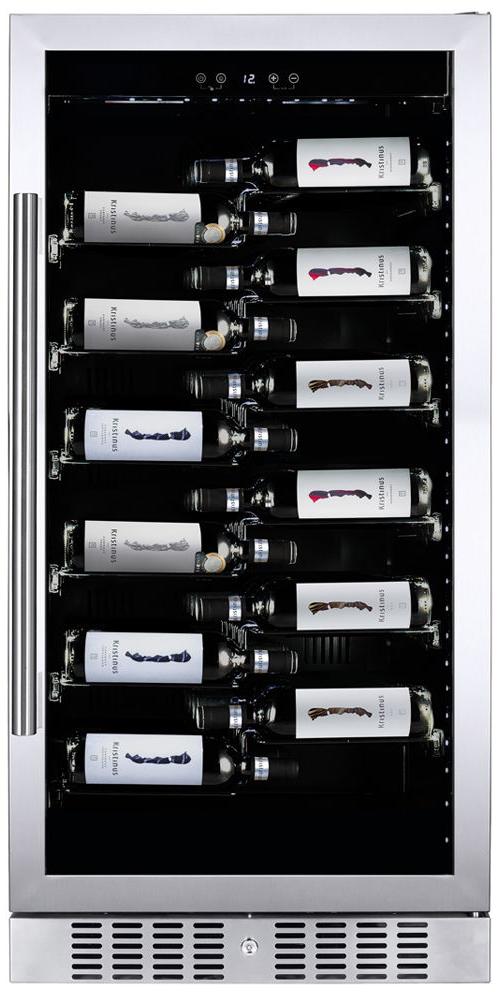 Стеклянная дверь — дополнительный изящный штрих к общему дизайну модели. Специальное покрытие защищает вино от влияния ультрафиолетовых лучей, которые проникают, если шкаф находится в солнечной комнате. Цвет корпуса — нержавеющая сталь. Дверь можно перевесить на другую сторону, поэтому вариантов размещения его в доме становится больше.