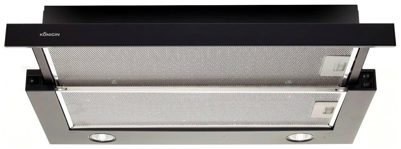 Полноразмерные алюминиевые жироулавливающие фильтры. Основной фильтр и фильтр на выдвижной панели одинакового размера, что гарантирует большую площадь поглощения загрязненного воздуха.