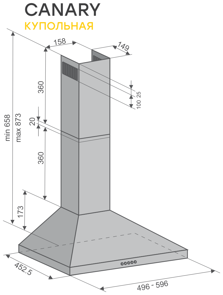 Купольная настенная модель Canary в высокотехнологичном корпусе из нержавеющей стали. Механические хромированные кнопки управления. Яркое светодиодное освещение, высокопроизводительный мотор. Купольная кухонная вытяжка монтируется на стену над варочной панелью, как самостоятельный элемент интерьера или между двумя верхними кухонными шкафами. Вытяжка может работать в двух режимах: отвод и рециркуляция.