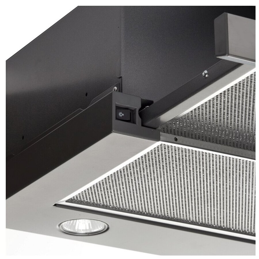 Полноразмерные алюминиевые жироулавливающие фильтры. Основной фильтр и фильтр на выдвижной панели одинакового размера, что гарантирует большую площадь поглощения загрязненного воздуха.