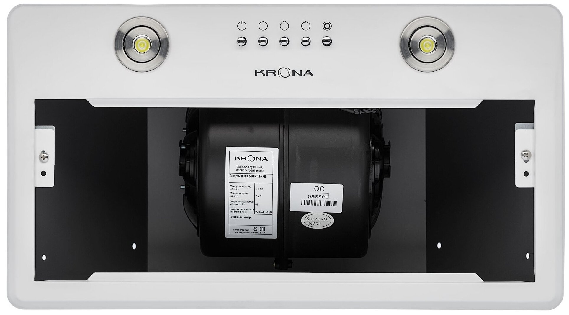 Вытяжка полновстраиваемая KRONA RUNA 600 PB с металлическим корпусом белого цвета своим лаконичным дизайном способна дополнить практически любой кухонный интерьер. Ведь большая часть ее корпуса будет скрыта в кухонной навесной секции. Производительность вытяжки составляет 845 м³/ч, что позволяет смело устанавливать ее на средние по площади кухни (до 13 м²). В зависимости от того, как часто и много придется готовить, вытяжку можно подключить к вентиляции (режим отвода) или оставить работать в режиме рециркуляции.