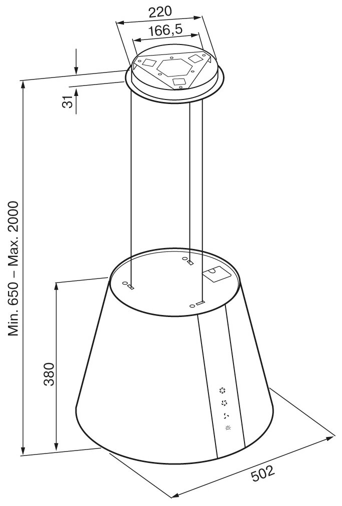 Островная вытяжка HOLLY выполнена в форме светильника. Данная конструкция вытяжки идеально вписывается в кухонное пространство.