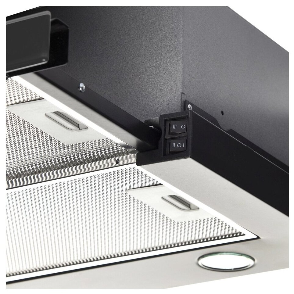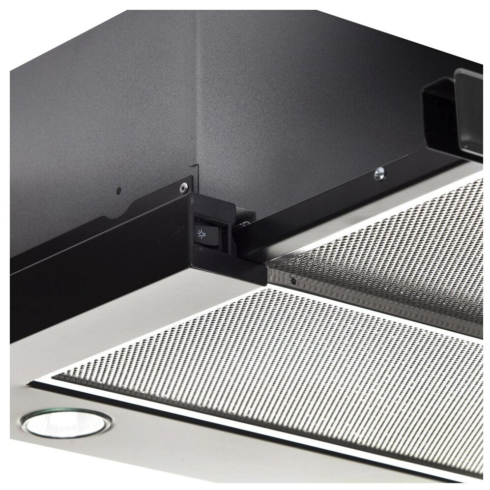 Полноразмерные алюминиевые жироулавливающие фильтры. Основной фильтр и фильтр на выдвижной панели одинакового размера, что гарантирует большую площадь поглощения загрязненного воздуха.
