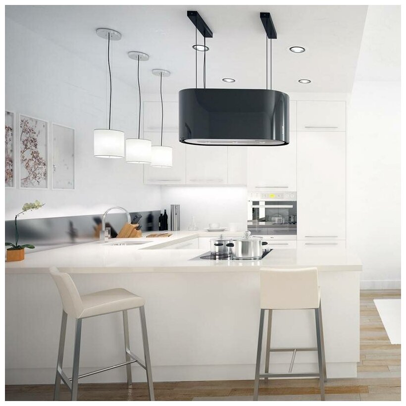 Кухонная вытяжка Konigin Serenity Black 80 102048 монтируется на регулируемых по высоте тросах, корпус полностью стеклянный, выполнен в форме эллиптического цилиндра.