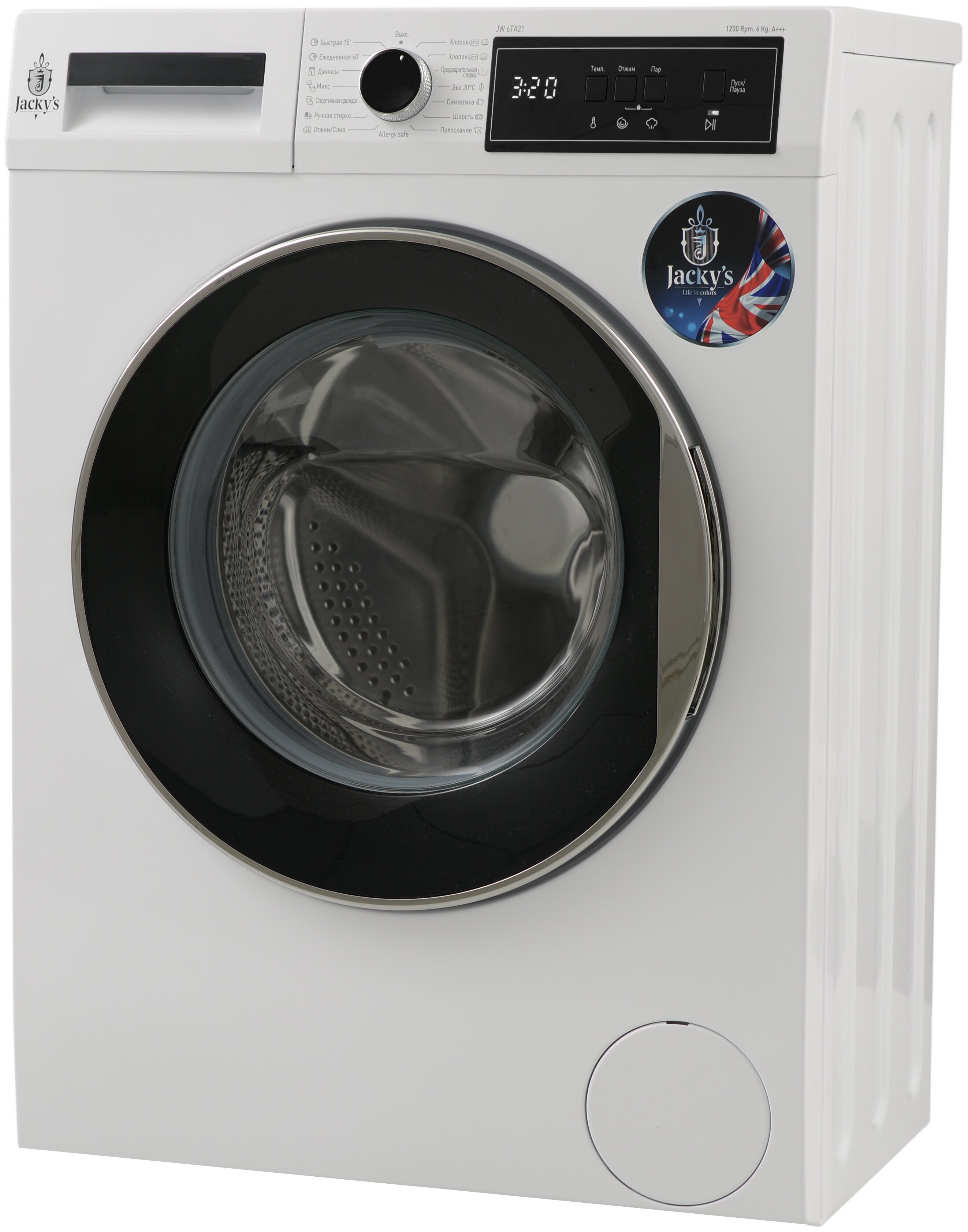 Стиральная машина Jacky's JW 6TA21 оснащена увеличенным загрузочным люком диаметром 33 см с широко открывающейся дверью. Для отображения информации о состоянии стирки и удобства настройки используется 7-сегментный дисплей LED. Панель управления можно заблокировать, избежав изменения программы стирки. Прибор поддерживает 15 программ, среди которых имеются: «Хлопок при 60 °C и 40 °C», «Предварительная стирка перед Хлопком», «Эко при 20 °C», «Шерсть», «Синтетика», «Ручная/Деликатная», «Противоаллергенный режим Allergy Smart», «Микс» и другие. Паровая система, встроенная в машину, делает процесс глажения легким и быстрым: пар проникает в волокна ткани, устраняя складки, что позволяет сохранить нежность и гладкость одежды.