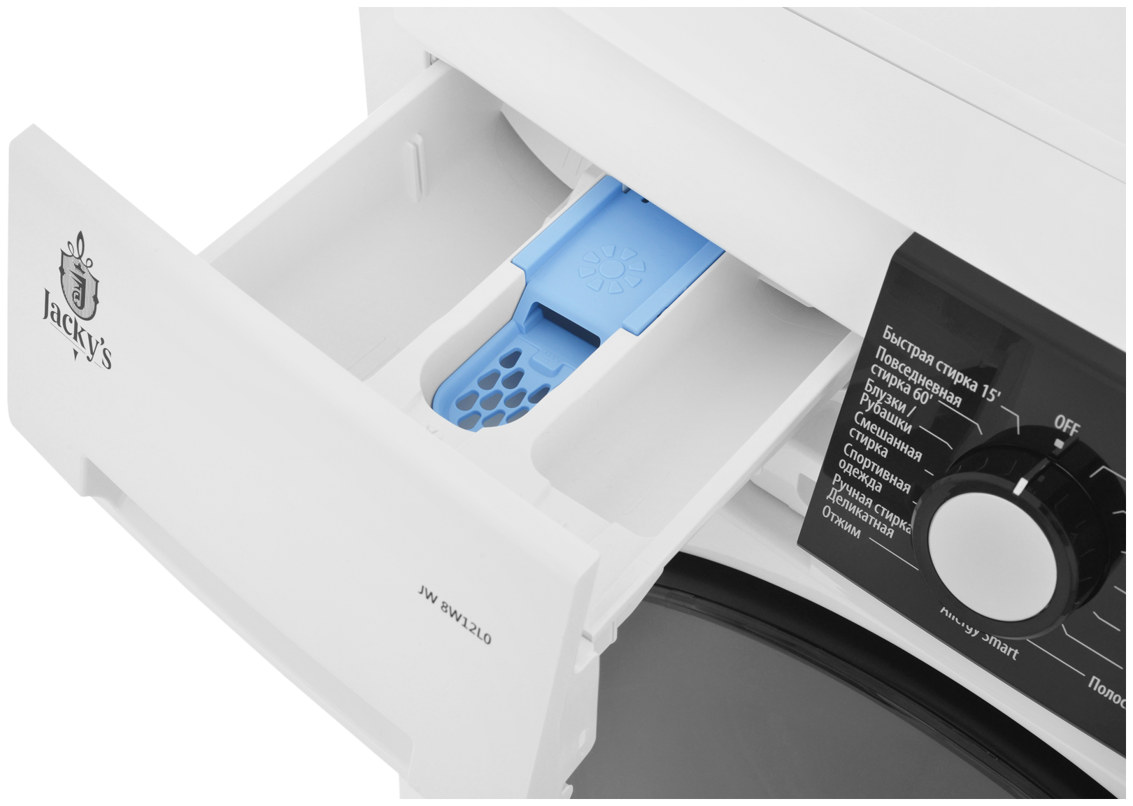 Стиральная машина Jacky's JW 8W12L0 предлагает пользователю различные программы. Машина имеет систему защиты от протечек, которая предотвращает затопление помещения при возникновении определённых неполадок. Функция блокировки панели управления делает её полностью безопасной для детей младшего возраста. Небольшой цифровой дисплей позволяет устанавливать оптимальные параметры стирки за считанные секунды. Кроме того, на нём отображается текущий цикл стирки и время, оставшееся до её завершения.