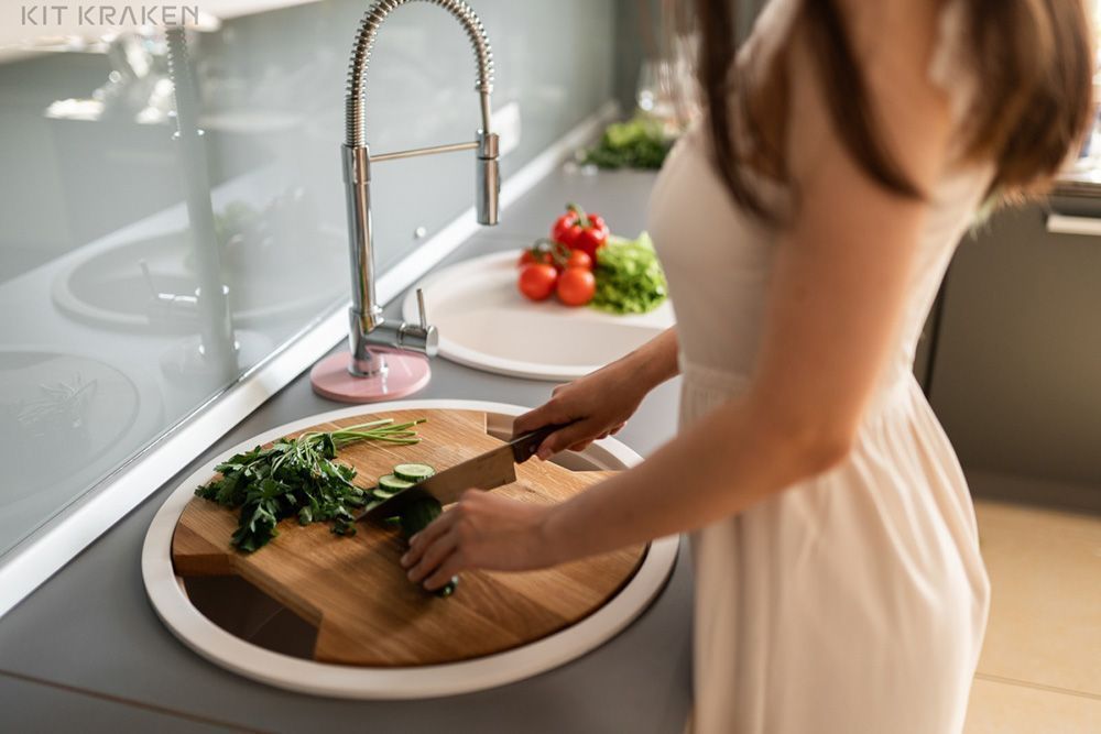 Разделочная доска по индивидуальному лекалу мойки, выполнена из натурального дуба, защищена от воздействия влаги и готова к использованию. Доска Kit Kraken продолжает рабочую зону и усиливает интерьер Вашей кухни.