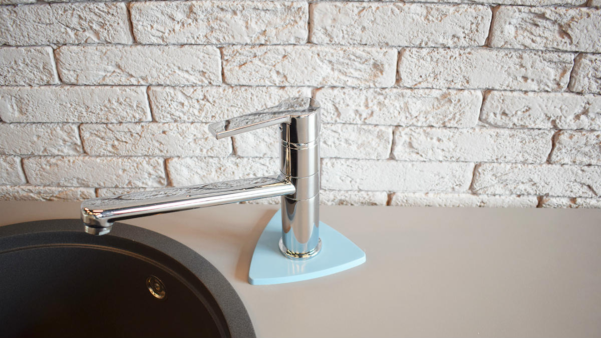 KitKraken Triangle - стильная треугольная подставка под смеситель. Изготовлена из искусственного камня. Выполняет не только декоративную функцию, но и защитную - защищает столешницу от разрушения при установке и использовании смесителя.