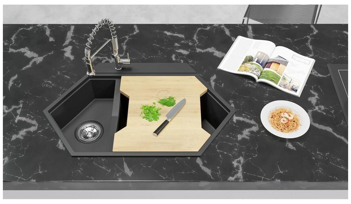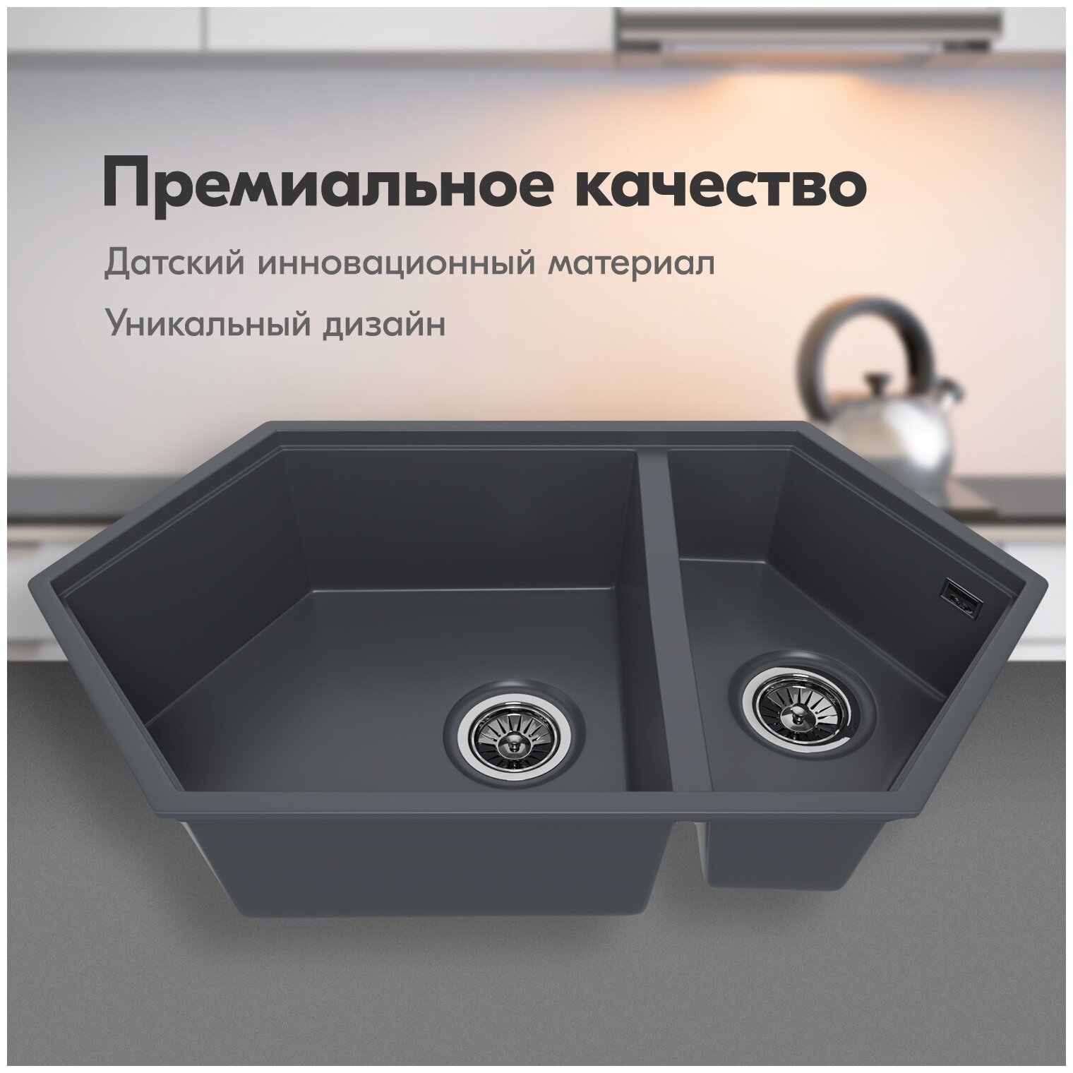 KitKraken Creek Graphite (цвет: темно-серый) - трапециевидная кухонная мойка для установки в прямой или угловой шкаф. Имеет увеличенную основную чашу и вместительную дополнительную, что позволит разместить посуду и продукты, осуществлять заготовки. Чаши имеют запатентованную пятиугольную форму, что делает раковину не только уникальной, но и позволит вместить сковородку вместе с ручкой.