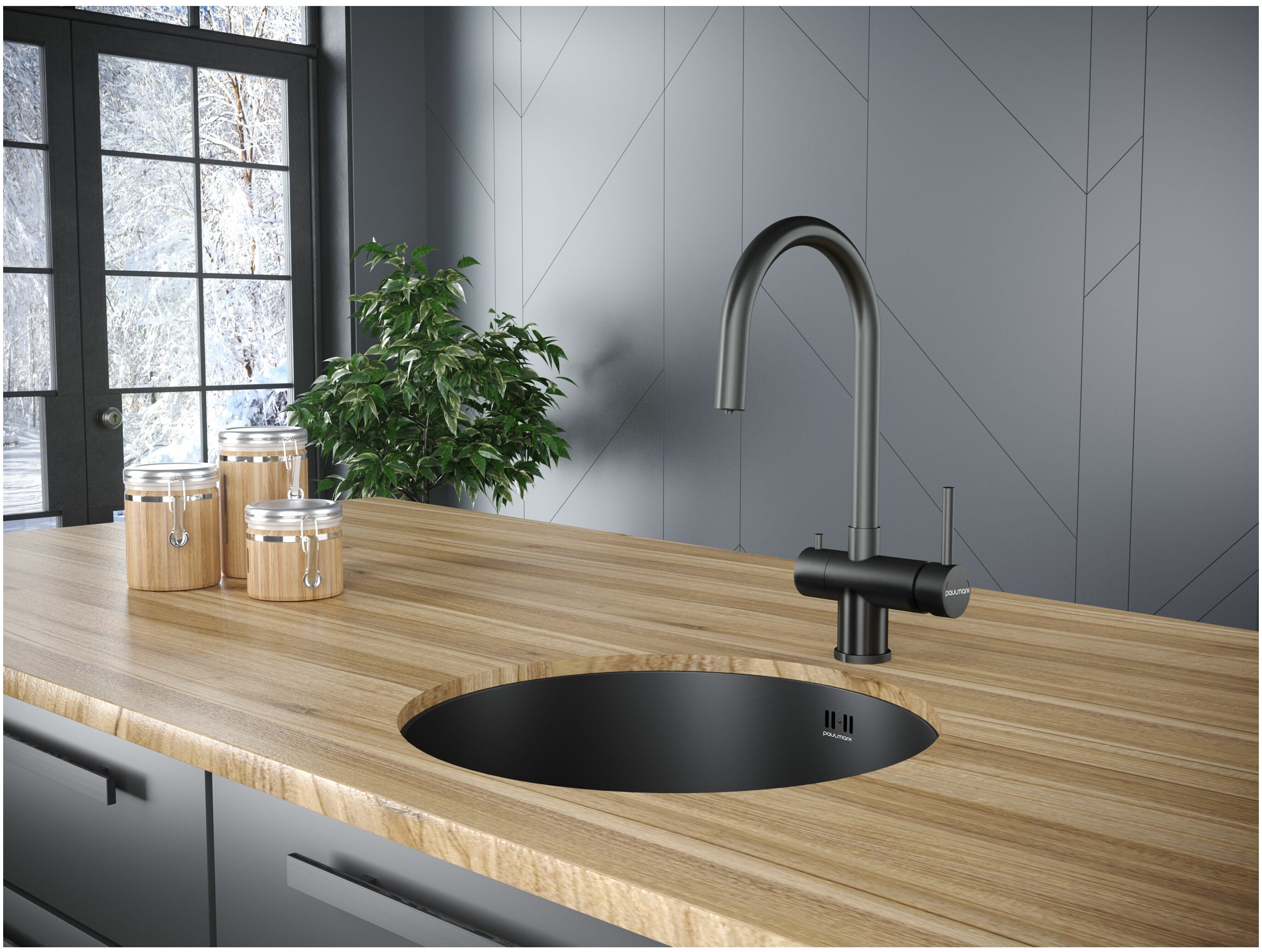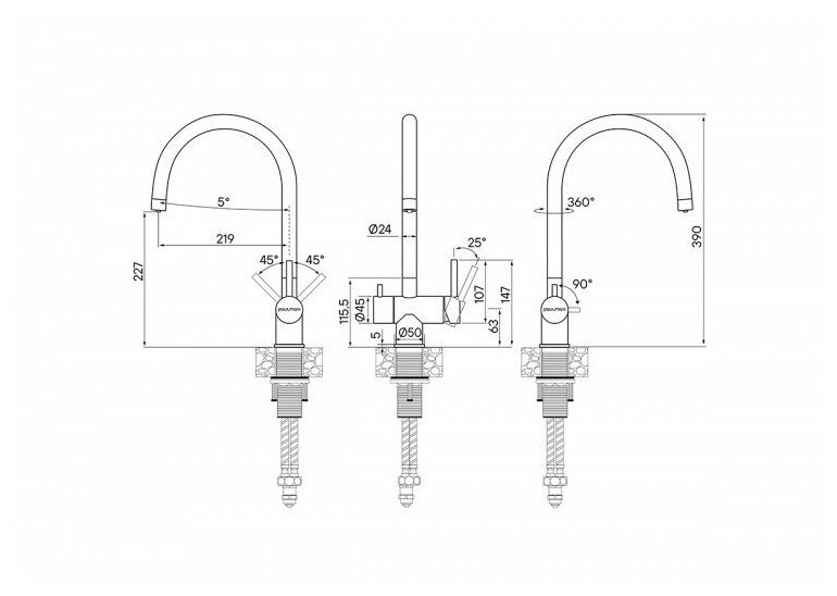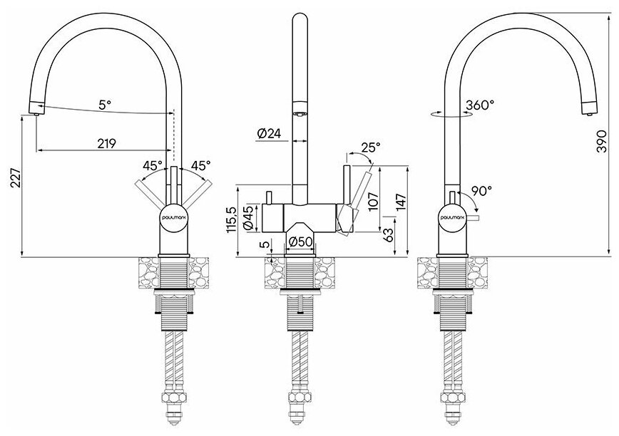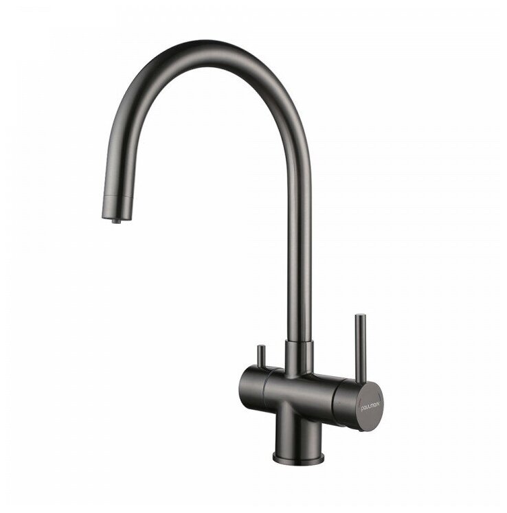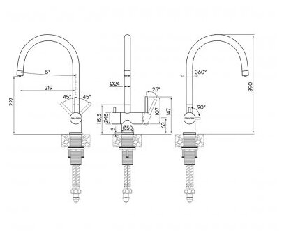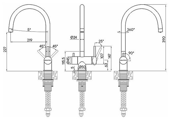 Изготовлен из нержавеющей стали AISI 304. Нержавеющая сталь AISI 304 легирована никелем, марганцем, медью и хромом, что обеспечивает ей повышенную прочность и устойчивость в коррозионных средах, такая сталь подвержена деформациям. Технология Trinkwasser®. Фильтрация питьевой воды. Конструктивная технология Trinkwasser® предусматривает поступление фильтрованной воды, которая не смешивается с водопроводной. Фильтрованная вода подается через отдельные трубку и аэратор. Высокий излив Высокий излив смесителя позволяет легко мыть и наполнять высокие сосуды такие как вазы или графины. PVD покрытие (цвета BG и GM) Покрытие PVD является наиболее экологически чистым. Особый метод напыления покрытия путем прямой конденсации пара наносимого материала позволяет поверхности смесителя быть особенно устойчивой к появлению царапин и истиранию. Такое покрытие является защитным слоем, оно чрезвычайно плотно и равномерно прилегает к основе, не содержит микротрещин. Поворотный аэратор Вращение на 360° позволяет легко управлять потоком воды. Подводка с нейлоновой оплеткой Комплект гибкой подводки для подключения воды и системы фильтрации имеет оплетку из нейлоновой нити, что значительно увеличивает срок службы подводки, а так же не позволяет появиться конденсату на шлангах.
