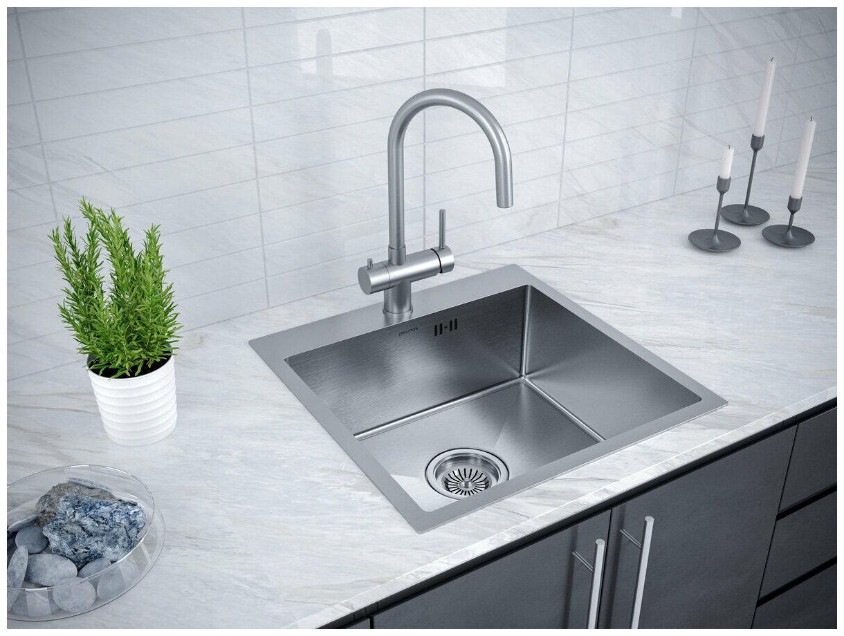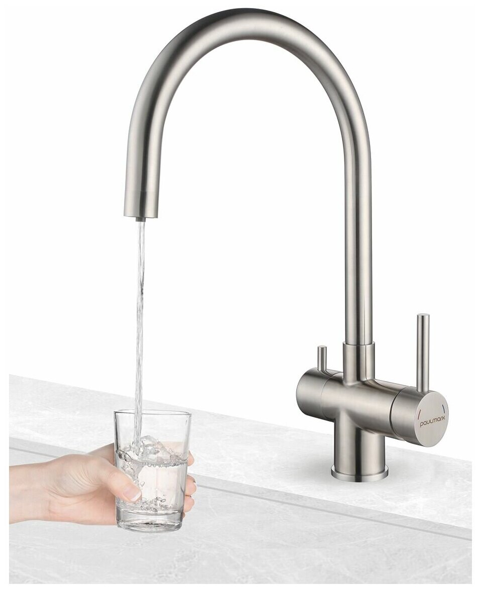 Paulmark Heller He213218-SS (цвет: нержавеющая сталь) - кухонный смеситель из нержавеющей стали марки AISI 304 с возможностью подключения фильтра питьевой воды. Нержавеющая сталь AISI 304 легирована никелем, марганцем, медью и хромом, что обеспечивает ей повышенную прочность и устойчивость в коррозионных средах, такая сталь подвержена деформациям. Конструктивная технология Trinkwasser предусматривает поступление фильтрованной воды, которая не смешивается с водопроводной. Фильтрованная вода подается через отдельную трубку и совмещенный аэратор. Высокий поворотный (360°) излив позволяет легко мыть и наполнять высокие сосуды такие как вазы или графины. Смеситель имеет высококачественную отделку, устойчивую к коррозии.