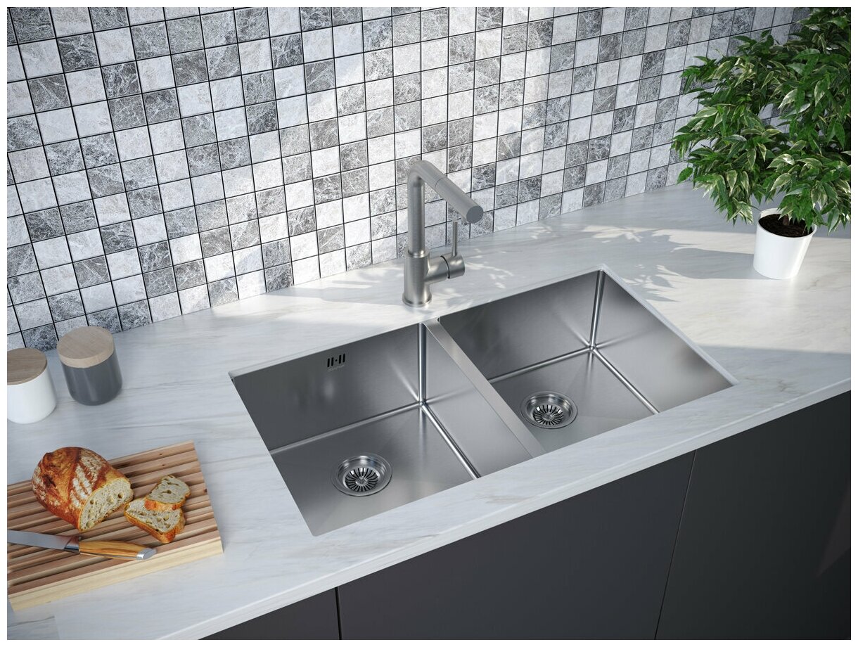 Конструкция смесителя с вытяжным шлангом значительно облегчает процесс мойки посуды или продуктов любого размера и формы.