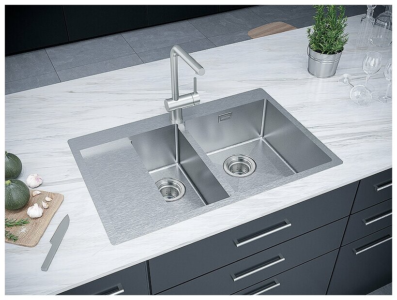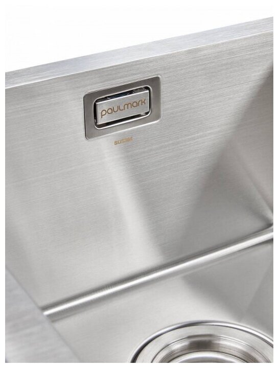 Paulmark Union PM537851-BSR - современная двухсекционная мойка для кухни. Обладает вместительной основной чашей, готовой выполнить основную работу, функциональной дополнительной чашей, которую можно использовать для промывки овощей или фруктов, и удобной сливной полкой для сушки посуды. Модель снабжена широкой площадкой под смеситель и врезные аксессуары (дозатор жидкого мыла, кран для питьевой воды).
