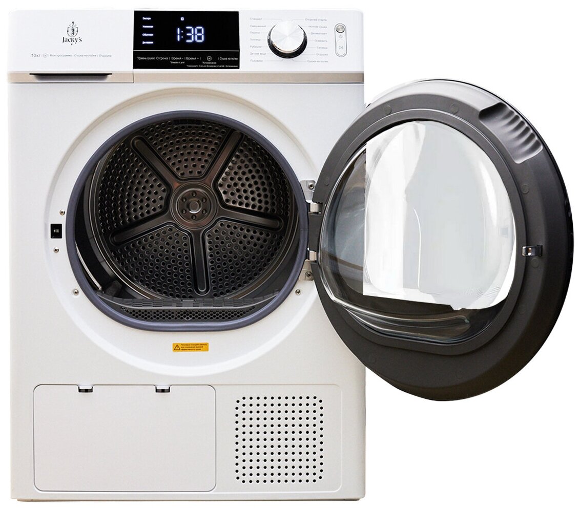 Сушильная машина JTD 103BHTB — незаменимое решение для бережного ухода за одеждой. Высота модели составляет 85 см, ширина — 59.5 см, глубина — 62.6 см.
