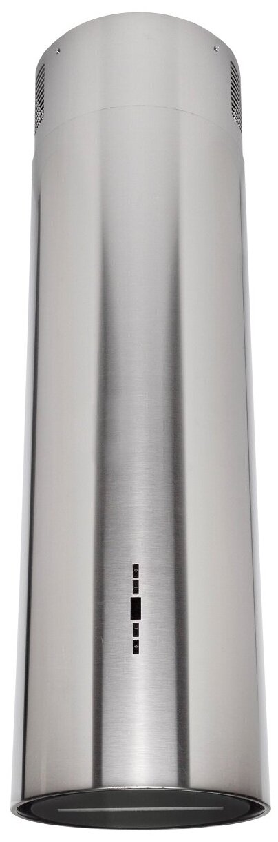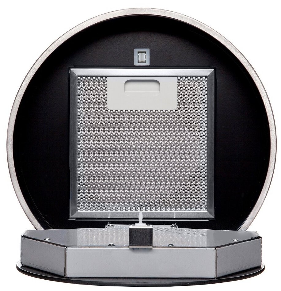Вытяжка выполнена в форме цилиндра. Геометрические формы повсеместно используется в современных дизайнерских проектах, они ассоциируются с простотой и лаконичностью, привносят в помещение гармонию и стиль. Стильное сочетание стали и блеска закаленного стекла создают ощущение легкости прочной конструкции. Декоративный стеклянный люк скрывает алюминиевый, жироулавливающий фильтр, придавая завершенность композиции