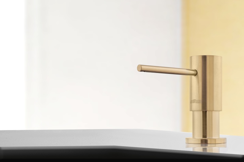 Дозатор для жидкого мыла Justime Still One цвета матового золота идеально сочетается с зототыми кухонными смесителями, а также с краниками для питьевой воды из серии Still One подобного цвета. Превосходное качество сборки и высокая надежность конструкции в сочетании с элегантным дизайном и роскошным цветом золота – залог большой популярности дозатора Justime Still One 6771-26-80KG.