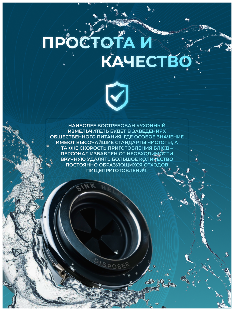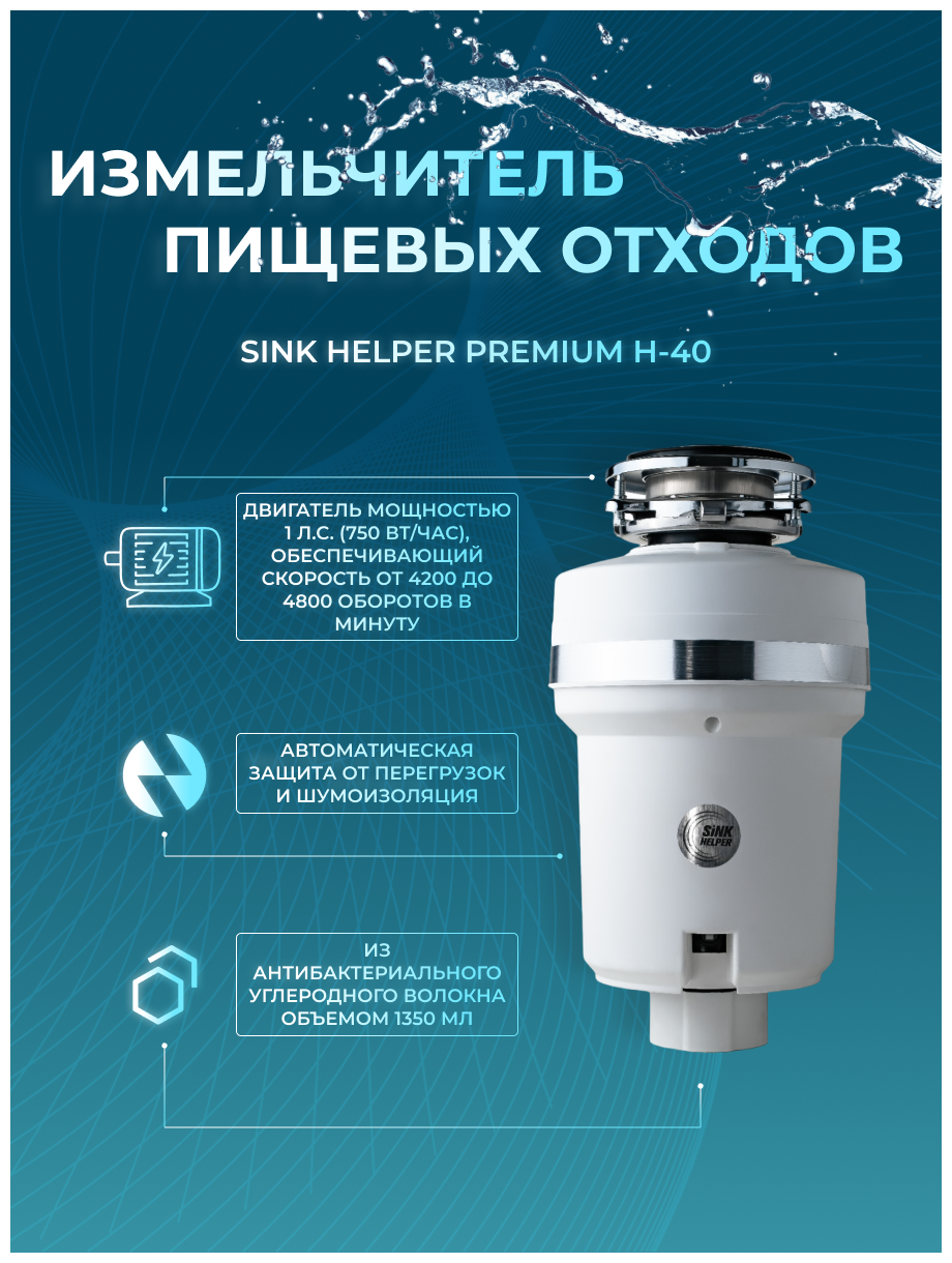 Самый мощный диспоузер в модельном ряду SINK HELPER подойдет для использования в кафе, барах, ресторанах, школьных и студенческих столовых, офисах, гостиницах, больницах. Вместительная рабочая камера объемом 1350 мл и двигатель мощностью 1 л. с. (750 Вт/час), обеспечивающий скорость от 4200 до 4800 оборотов в минуту. Износостойкие цельнолитые ударные кулачки, шумоизоляция, магнитный улавливатель – в этой модели присутствуют все необходимые элементы современного и надежного оборудования для удаления пищевых отходов. Встроенная клавиша дистанционного запуска автоматически отключит прибор через 5 минут, если вы забыли это сделать. Несмотря на полупромышленные характеристики измельчитель SINK HELPER Premium H-40 прост в установке и использовании, питается от сети 220В. Наиболее востребован кухонный измельчитель будет в заведениях общественного питания, где особое значение имеют высочайшие стандарты чистоты, а также скорость приготовления блюд – персонал избавлен от необходимости вручную удалять большое количество постоянно образующихся отходов пищеприготовления.