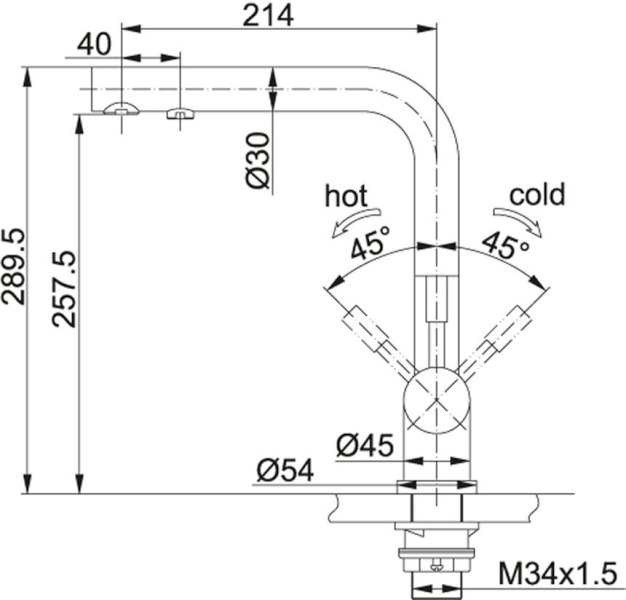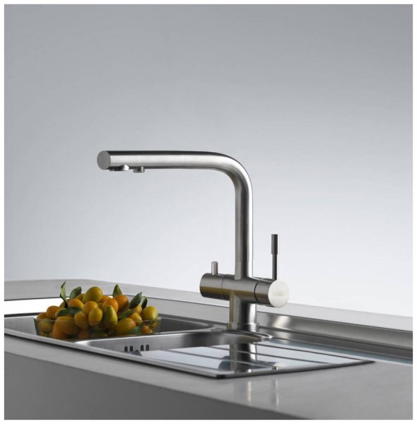 Современный дизайн. Смеситель переключается на фильтр отдельным рычагом слева. Дополнительный излив для фильтрованной воды. В одном изливе осуществляется тройной подвод воды: большим рычагом включается холодная/горячая, фильтрованная — малым рычагом.