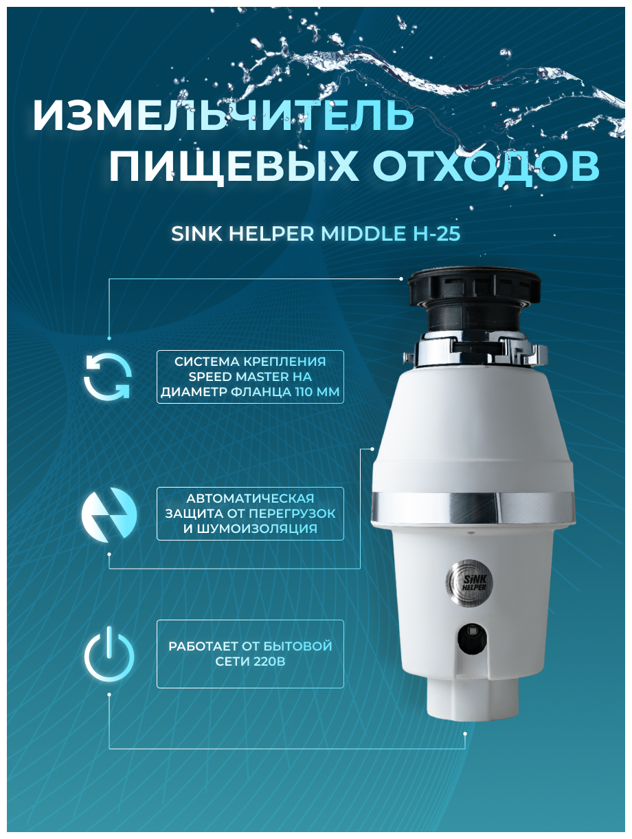 К Модификация модели SINK HELPER Middle H-24 с увеличенным объемом рабочей камеры 950 мл и системой крепления SPEED MASTER на диаметр фланца 110 мм. Кухонный измельчитель работает от сети 220В, имеет автоматическую защиту от перегрузок и встроенную систему запуска. Механизм диспоузера изготовлен из высокопрочных материалов, что обеспечивает его надежную работу на протяжении длительного времени (гарантийный срок составляет 6 лет). Вращающиеся со скоростью 2800-3200 оборотов в минуту цельнолитые ударные кулачки эффективно измельчают все пищевые отходы для их немедленного удаления и поддержания гигиенической чистоты на кухне. Рабочая камера изготовлена из антибактериального углеводородного волокна. В комплект кухонного измельчителя входит магнитный браслет, задерживающий металлические предметы, попадающие в слив раковины.