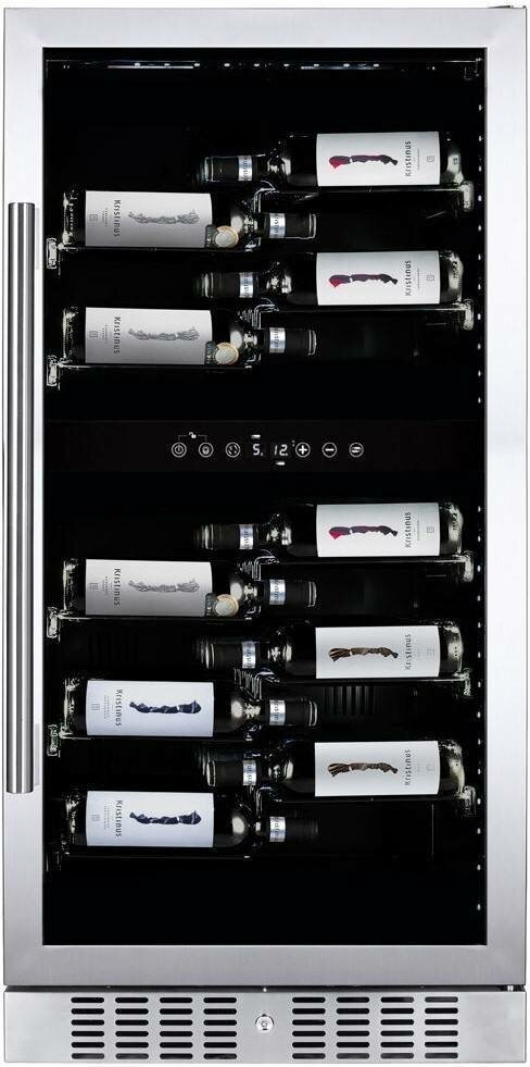 Стеклянная дверь — дополнительный изящный штрих к общему дизайну модели. Специальное покрытие защищает вино от влияния ультрафиолетовых лучей, которые проникают, если шкаф находится в солнечной комнате. Цвет корпуса — нержавеющая сталь.