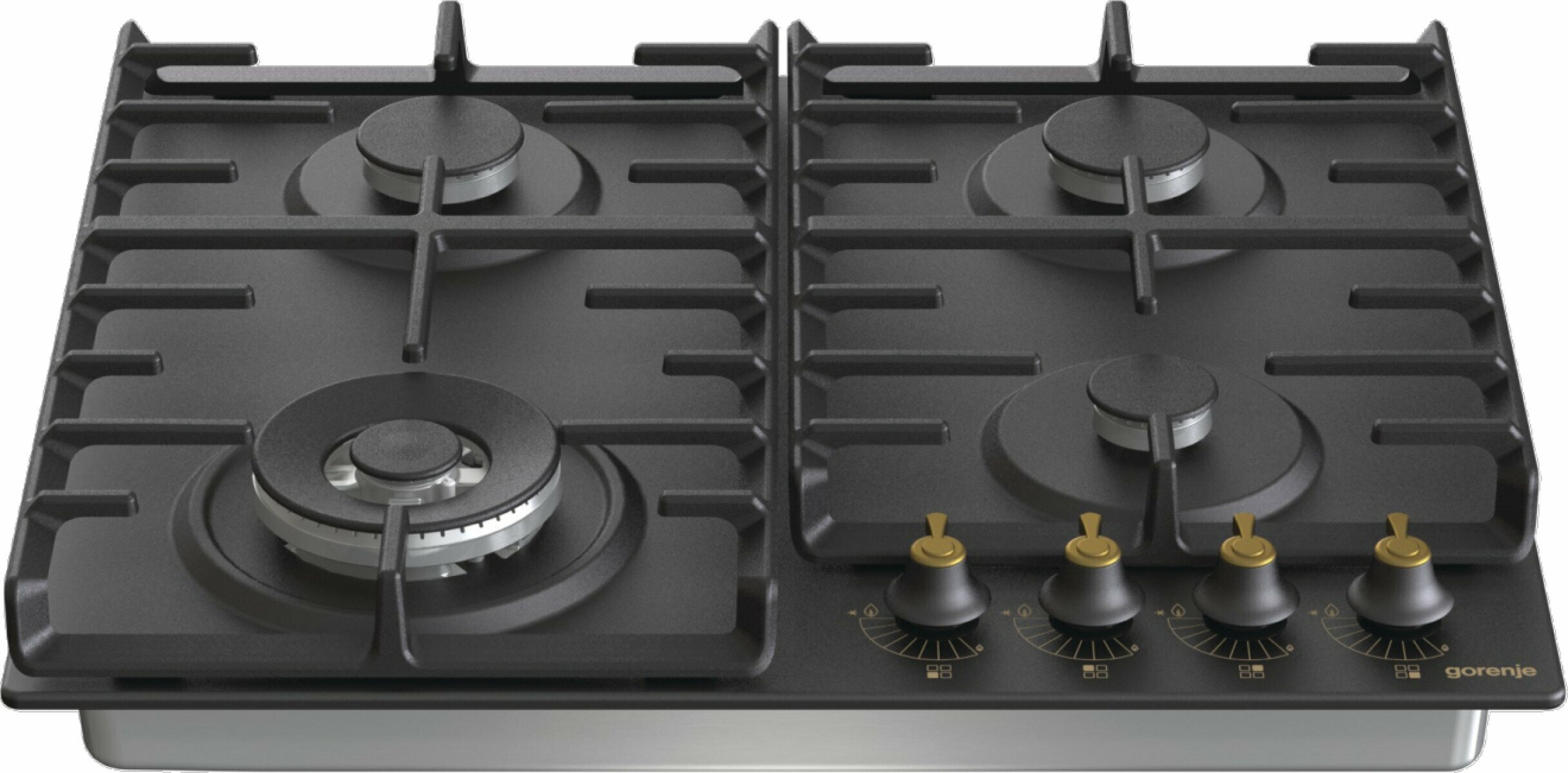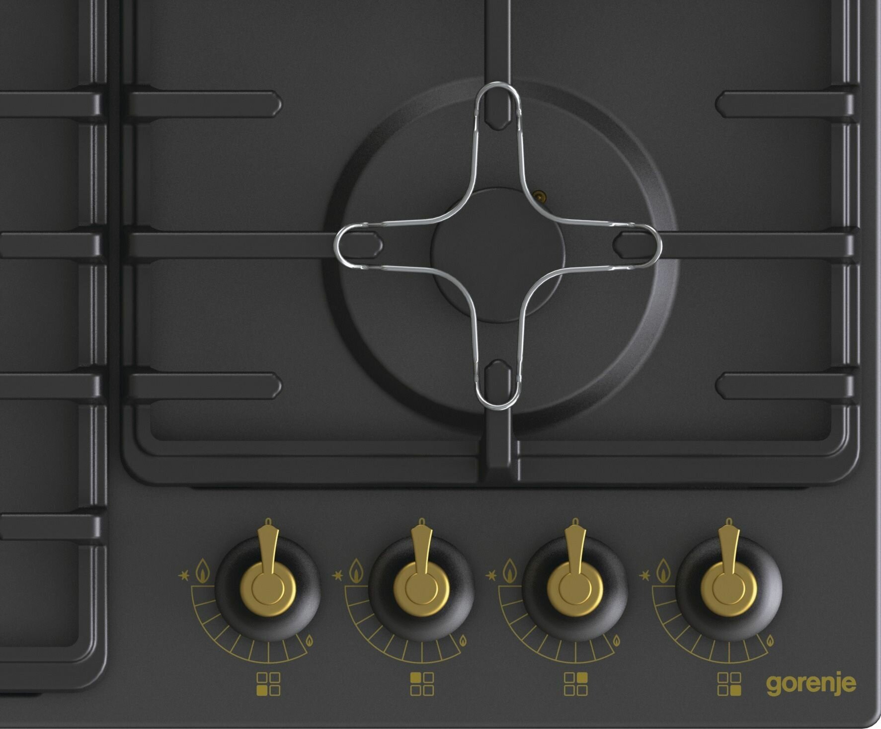 Варочная панель Gorenje GW642CLB представлена в черном цвете с бронзовой фурнитурой. На двухконтурной конфорке «WOK» пища гораздо быстрее готовится и поддается равномерной тепловой обработке. Чугунные решетки легко очищаются от загрязнений. Газ-контроль не допустит утечки газа, при неконтролируемом затухании горелки.