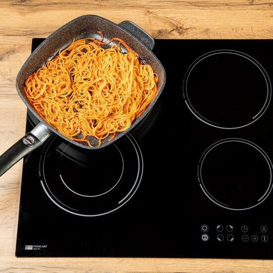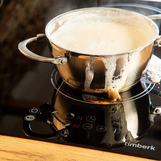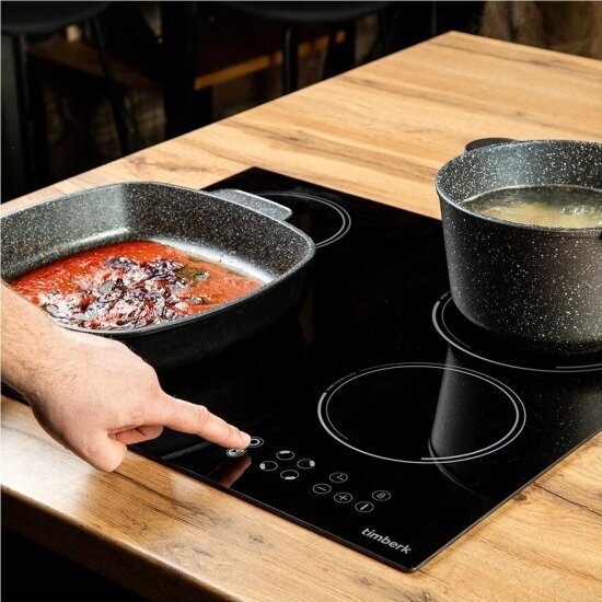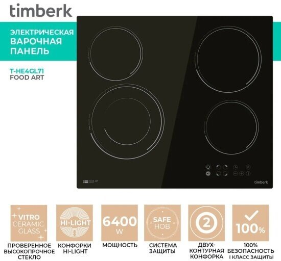 Электрическая встраиваемая варочная панель TIMBERK T-HE4GL71 с сенсорным типом управления имеет номинальную потребляемую мощность 6400 (1200/1800/1100/1200) Вт, материал поверхности панели стеклокерамика, 4 зоны нагрева, диаметр конфорок 165/200/140/165 мм, размер ниши для встраивания 555х495 мм. Система защиты: Класс электробезопасности: I, Блокировка панели, Функция «Safe Hob» - защита от перегрева и перелива конфорок Безопасное отключение конфорки при условии слишком высокой, температуры нагрева (например, если нагревается пустая посуда) или при попадании воды на конфорку. Класс энергосбережения А.