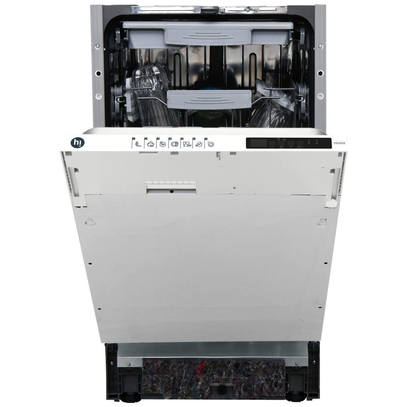 Встраиваемая посудомоечная машина HI HBI40332 шириной 45 см вмещает 10 комплектов посуды, расход воды за один цикл не превышает 9 л. Прибор оснащен семью программами мойки, в том числе быстрым и интенсивным режимом. Машину можно загружать частично.