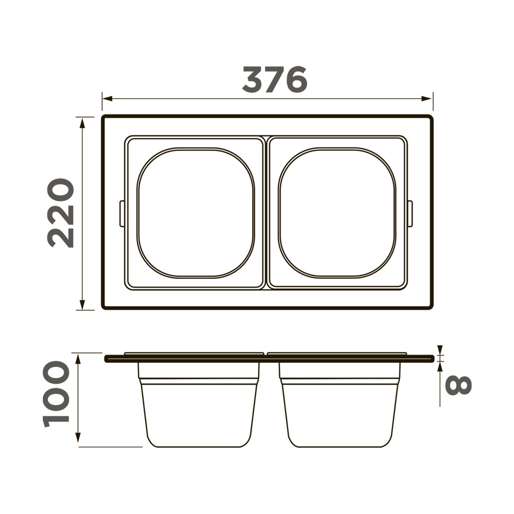 Контейнеры коллекции DC представляют собой различные конфигурации, состоящие из нескольких элементов: одной, двух или трех чаш, изготовленных из нержавеющей стали и фиксирующей подставки, изготовленной из высокопрочного HPL пластика. Чаши свободно вынимаются из пластиковой подставки и перемещаются, а конструкция подставки разработана таким образом, чтобы ее можно было удобно разместить на внутренних ступенчатых направляющих моек, коллекций SINTESI и KITAGAWA