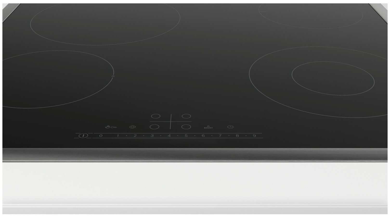 Встраиваемая электрическая панель Bosch Serie 2 PKF 645FP3R выполнена из стеклокерамики и окружена рамкой из стали. Модель оборудована четырьмя конфорками, одна из них двухконтурная. Мощность подключения составляет 7100 Вт.