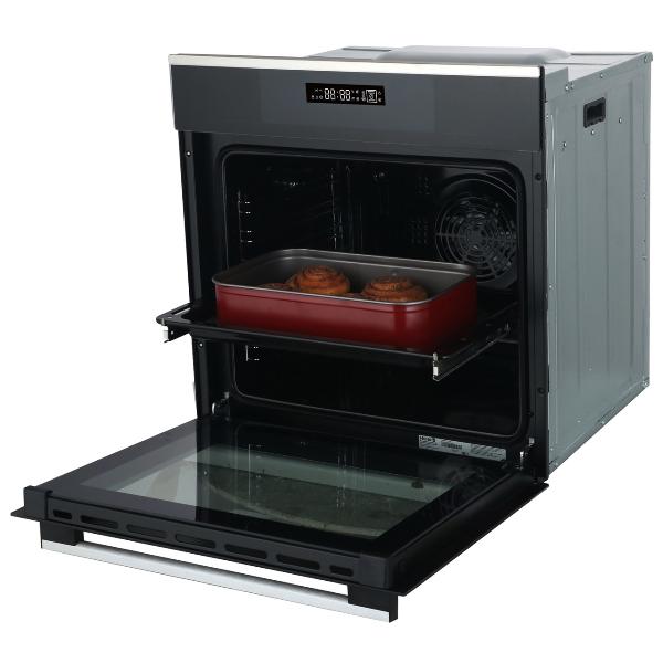 Дверца укомплектована трехслойным стеклом, откидывается вниз. Устройство соответствует классу энергоэффективности А. Потребляемая мощность составляет 3,15 кВт. Модель поставляется в комплекте с решеткой, глубоким и плоским противнями, которые размещаются на телескопических направляющих.